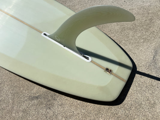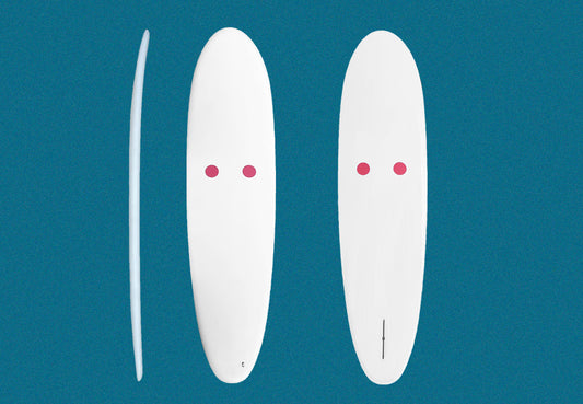 While shaping is a science, laminating is an art. We source the best pigments and custom mix the colour into the resin. There are so many factors to consider, like hue, depth, and transparency. There is no magic wand tool here, it takes a lot of time and experience to get it right. All boards come out slightly different because of length, volume of resin, and the different ounce cloth. The darker rails and fin patch are actually a naturally occurring element - the double lapping of layers means more colour soaks into the cloth, creating the darker shades.