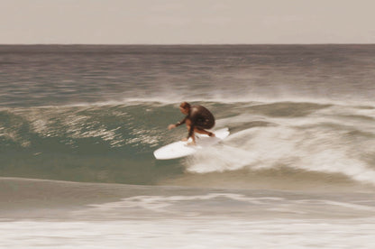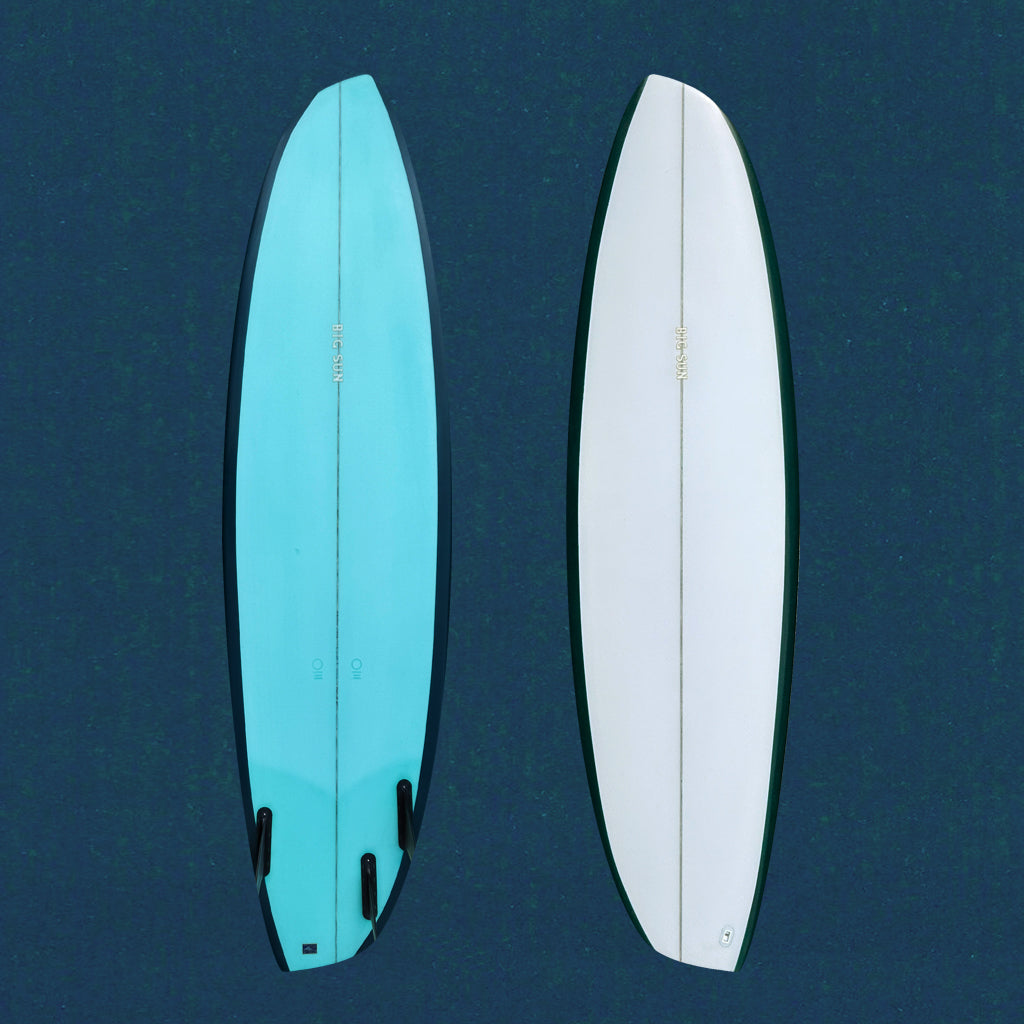 The fin set up on this side is that of a twin fin with a classic shape and size. The heel side rail flows down into a rounded tail similar to that of a high performance thruster. The fin setup on the heel side can be a quad or a thruster.