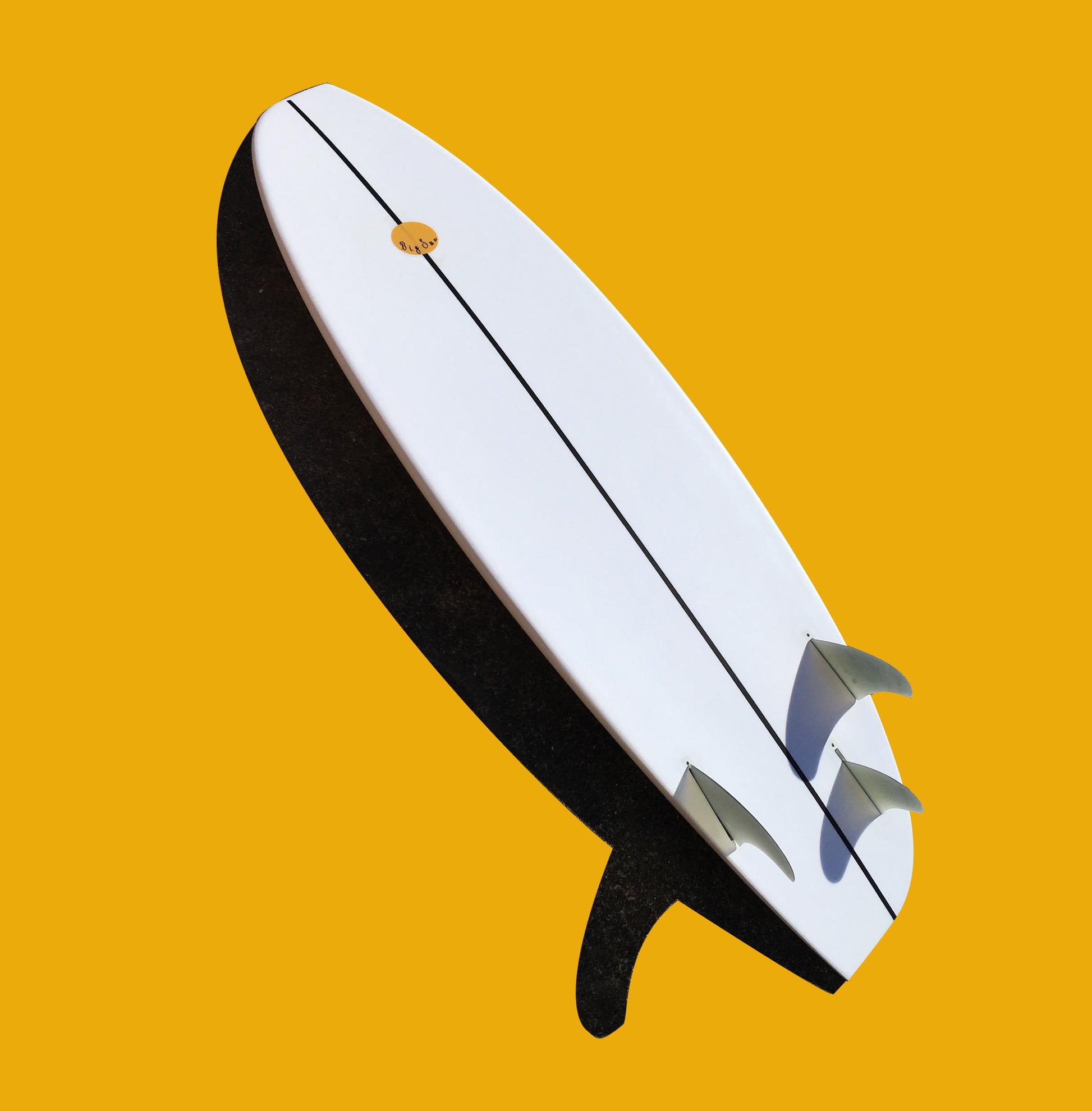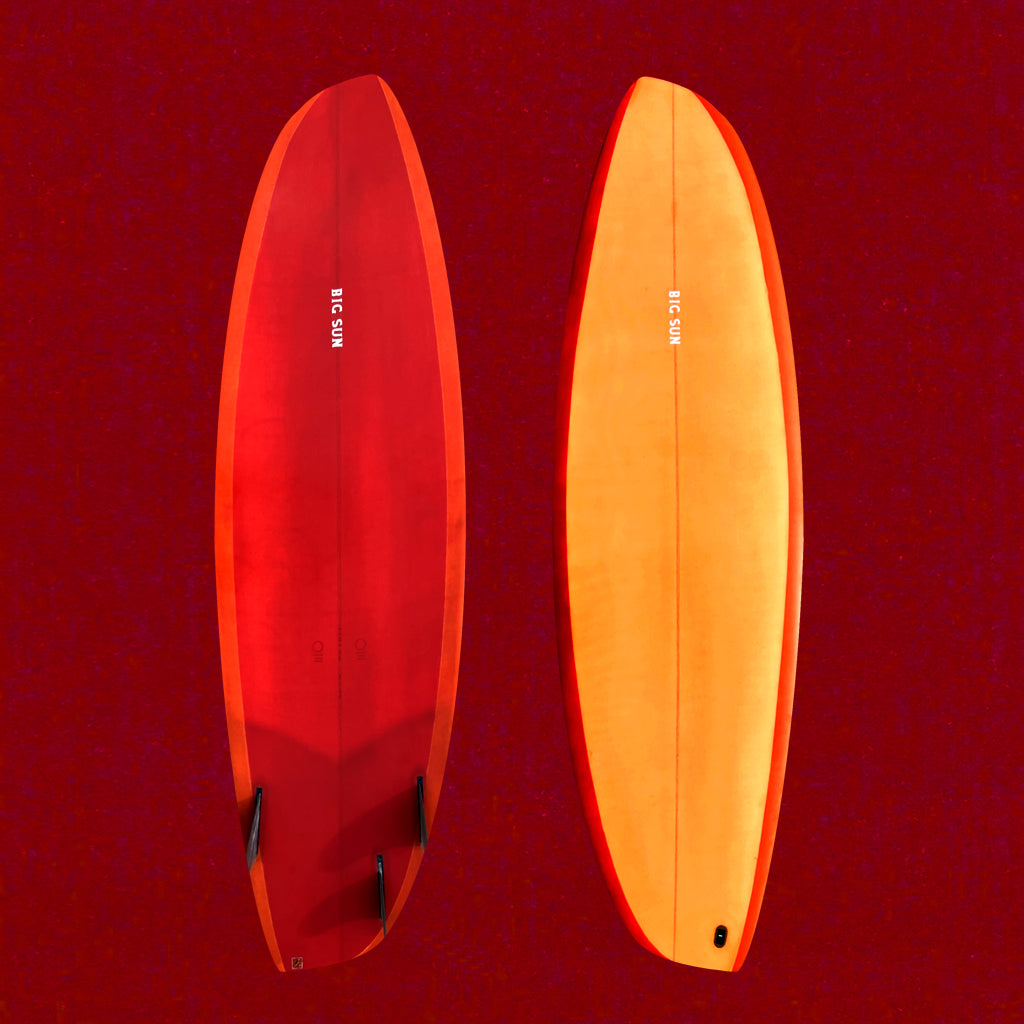 A high performance asymmetric surfboard. Three factors considered: rail, tail and fin set up. The toe side rail leads into a broad flat tail simulating a twin swallow, and implementing the broad planing surface and speed one generates from the twins and fishes.